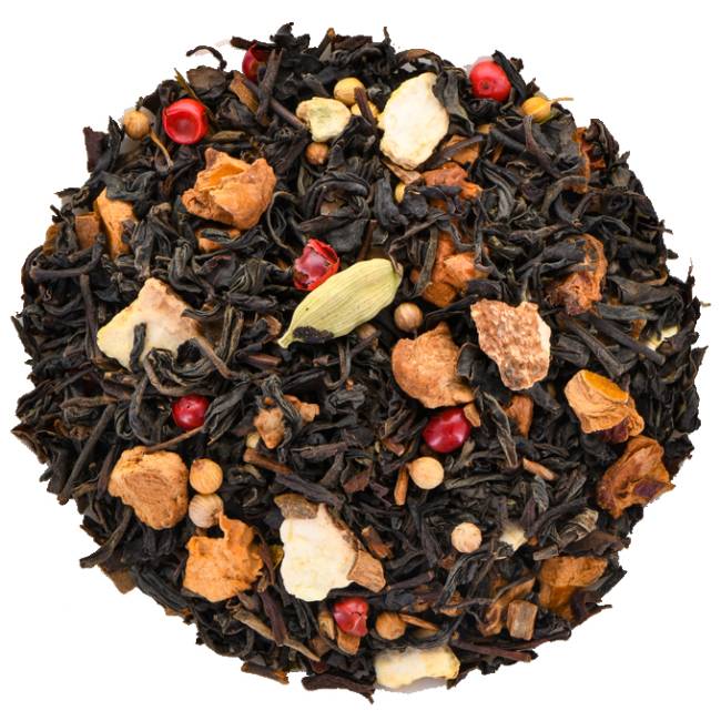 Ingrédients : Mélange de thé noir*, morceaux de pomme*, morceaux de cannelle*, écorces d'oranges*, coriandre*, cardamome*, arôme naturel d'amande, poivre rose*, huile d'essence d'orange*, huile d'essence d'écorce de cannelle*